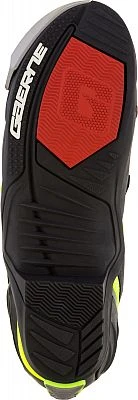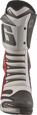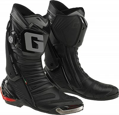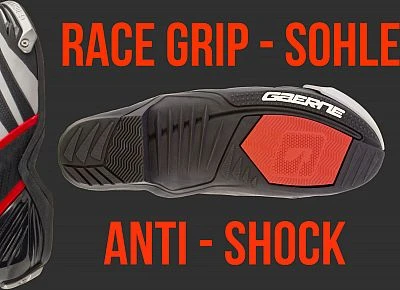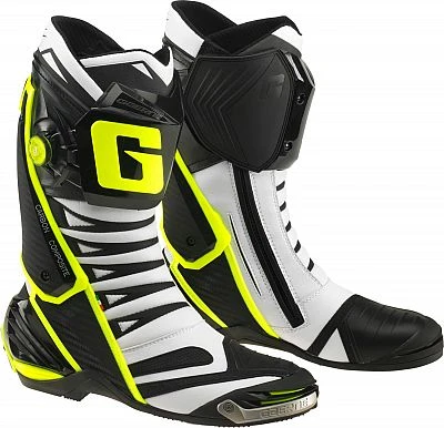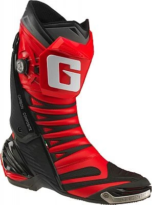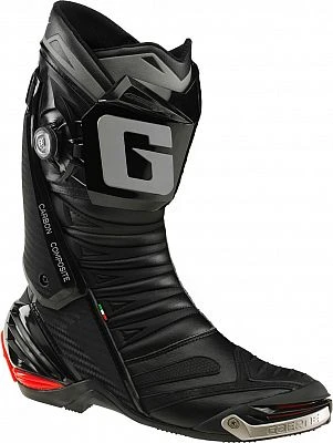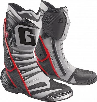 Der Motorradstiefel GP1 Evo wird aus dem geschmeidigen, komfortablen und atmungsaktiven Hightech-Material Lorica hergestellt. Bei diesem Modell kam das hauseigene aus Carbon-Material gefertigte Gaerne Floating-System zum Einsatz. Das System wird an der Hinterseite des Stiefels an zwei Punkten fixiert. Es erlaubt dem Träger sich so natürlich wie möglich zu bewegen und garantiert gleichzeitig, dass der Fuß nicht umknicken kann, ohne das die Flexibilität beeinträchtigt wird. Außenliegende Protektoren minimieren die Auswirkungen eines Sturzes. Zur bereits sehr sicheren Ausstattung des GP1 kommt eine Anti-Shock Ferseneinlage. Die Stoßabsorbierende Einlage besteht aus einer unverformbaren Polyurethan Fersenschale, welche zusätzlich durch einen austauschbaren und reibungsarmen Magnesium Kappe geschützt wird. Die Anti-Schock- Ferse verfügt über einen internen komfortsteigernde Dekompressionszone, die sich zwischen der Einlegesohle und Sohle befindet. Dies wird von außen durch die roten Einsätzen hervorgehoben. Dank des atmungsaktiven, antibakteriellen und vorgeformten Innenfutters besteht zu jederzeit ein optimales Tragegefühl. Neben dem Mikroklima spielt auch Tragekomfort und Bewegungsfreiheit eine große Rolle. Hierfür integrierten die Entwickler elastische Einsätze und eine stufenlos verstellbare Wadenweiten-Regulierung mit dem BOA-Verschlusssystem. Diese beiden Ausstattungsmerkmale erlauben dem Träger, den Stiefel so perfekt an seinen Fuß anzupassen. Damit der Stiefel bei Schräglage und der dabei benötigten Haltung nicht beschädigt wird, befinden sich an der Spitze des Stiefels Magnesium-Zehen-Schleifer, welcher schnell und einfach ausgewechselt werden kann. Letztlich leistet eine Multi-Density-Sohle für optimalen Grip und verhindert so mögliches Abrutschen. Alles in allem bietet der GP1 Evo dem Träger einen optimalen Schutz.