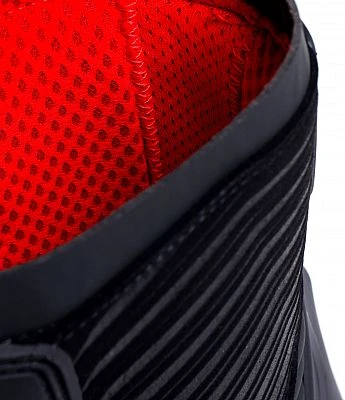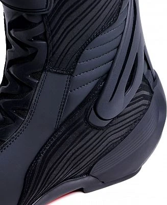 Das D.F.C.-System verfügt über einen PU-Rahmen, der mit zwei seitlichen, verdeckten Schrauben am Fersenschutz auf Höhe des Knöchels am Stiefel befestigt ist. Im hinteren Teil des Schuhs ist das System mit zwei Laschen ausgestattet, die in spezielle Sicherheitstaschen gleiten, die eine Flexibilität des Rückens von bis zu 13 Grad ermöglichen und eine Überdehnung des Knöchelgelenks verhindern, um das Verletzungsrisiko zu begrenzen. Der PU-Rahmen des Systems ist dünn und um den Stiefel herum geformt, um eine flache Innenfläche zu bieten, die einen guten Halt auf dem Motorrad ermöglicht und verhindert, dass man während der Fahrt auf dem Motorrad hängen bleibt. Das D.F.C.-System ist so konstruiert, dass es auch bei einem Aufprall einen überragenden Schutz bietet; der Fersenschutz ist so konstruiert, dass er Aufprallenergie und Kompression absorbiert, und er ist mit einem hinteren und seitlichen Schieber ausgestattet, um das natürliche Gleiten im Falle eines Sturzes zu erleichtern.